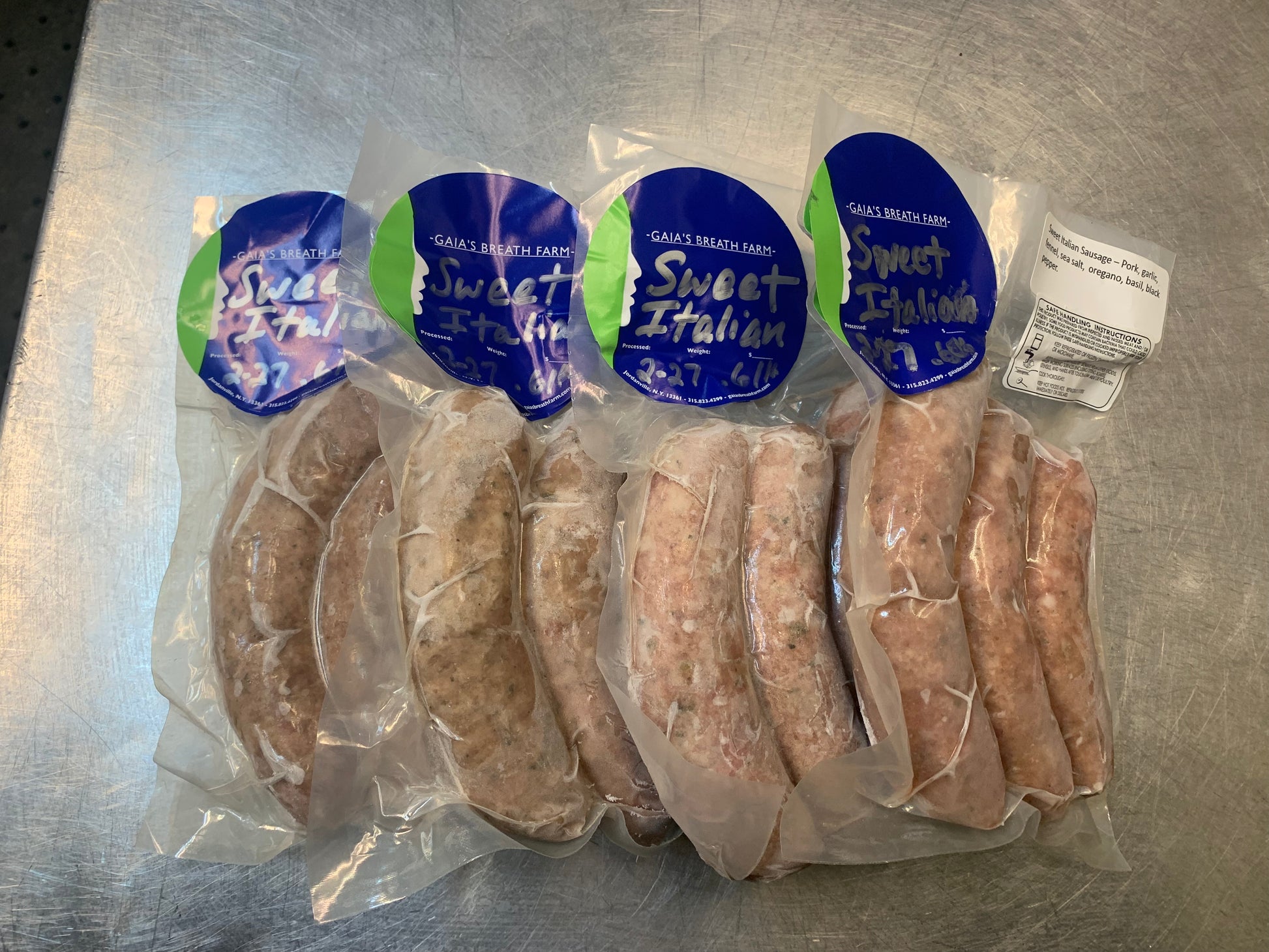 Sweet Italian sausage ingredients - pork, biodynamic garlic, organic fennel, sea salt, organic herbs & spices, organic black pepper